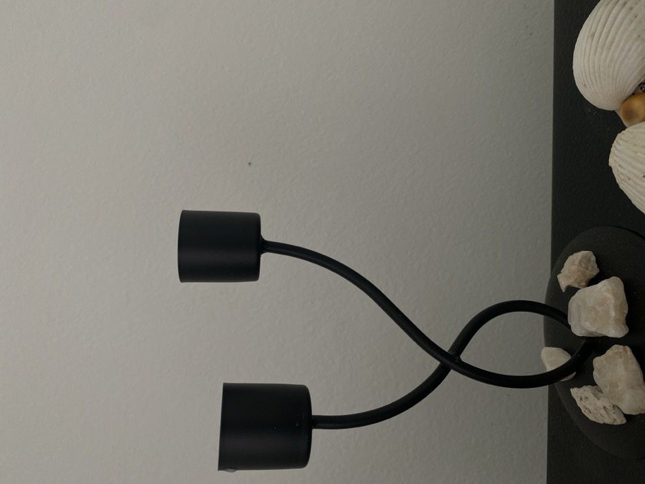 A black, decorative candle holder is positioned against a plain, light-colored wall. The holder features two cylindrical candle bases attached to curving metal rods that intersect in the center. The base of the holder, a circular disk decorated with white stones, is affixed to a vertical, rectangular black backing. White seashells are glued to the top of the backing.