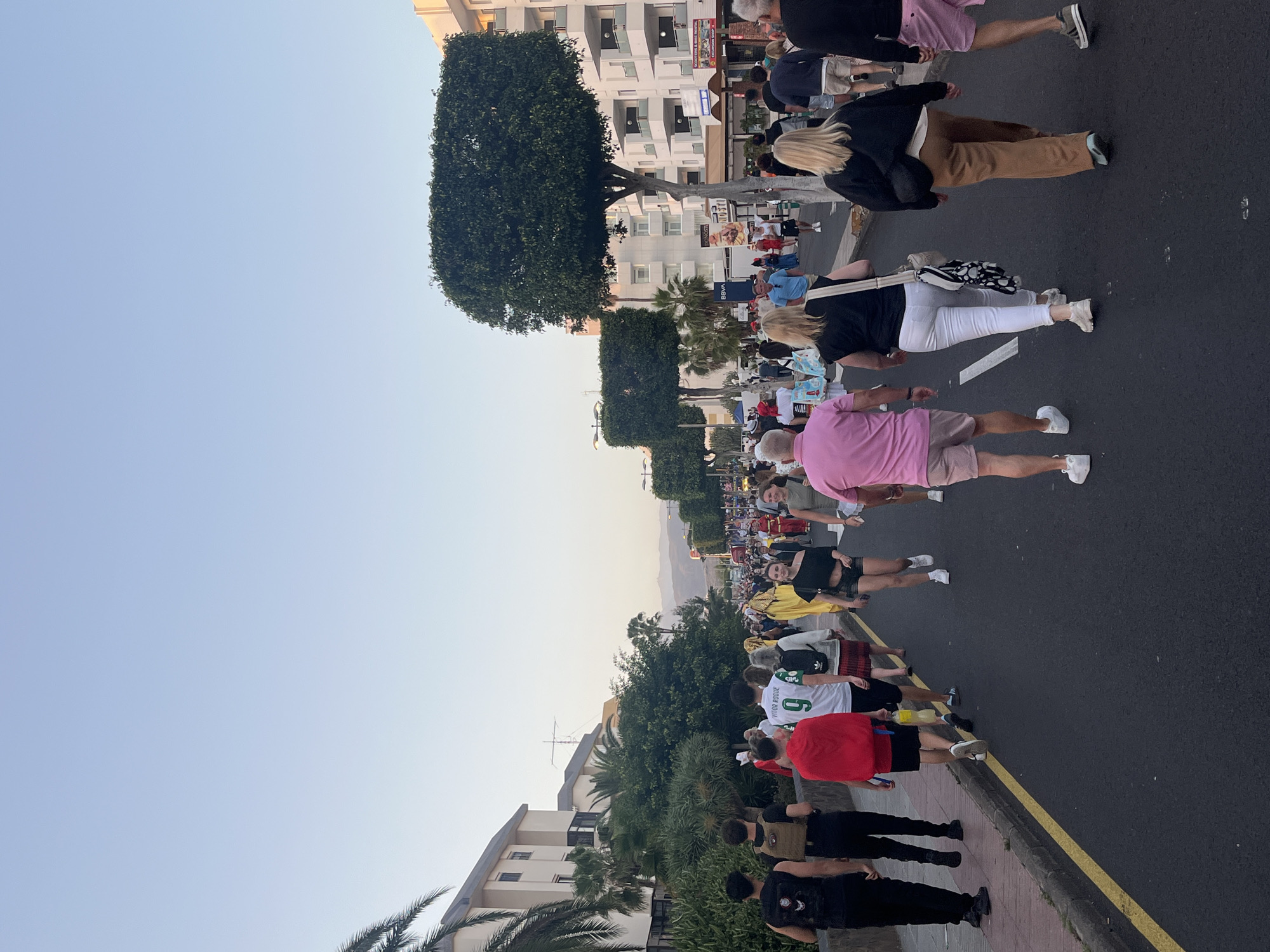 The image depicts a street in San Bartolomé de Tirajana, Spain, crowded with people. The street is paved with asphalt, marked with a yellow curb line, and lined with trees. Buildings, including multi-story apartments, are visible in the background. The people are walking along the street in both directions. They are wearing a variety of clothing, including casual attire, jerseys, and pink shorts. Some people appear to be tourists. The sky is clear and light blue.