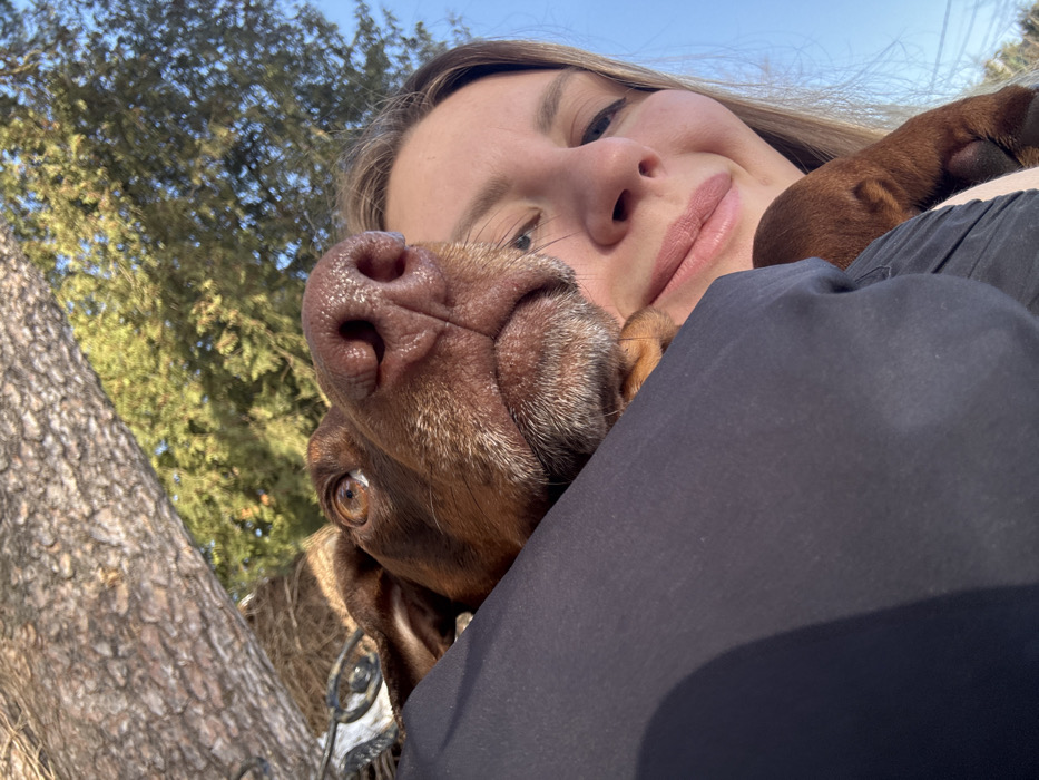 - "The image displays a close-up, upward-angled view of an adult female and a brown dog outdoors in Zelenogradskiy, Russia" by FM-xqHZp2, licensed under CC BY 4.0