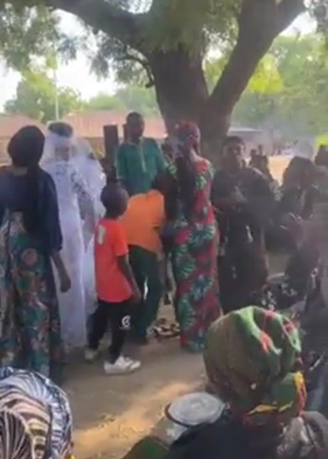 A wedding celebration is underway outdoors, likely in a village setting, with attendees standing around a bride in a white dress