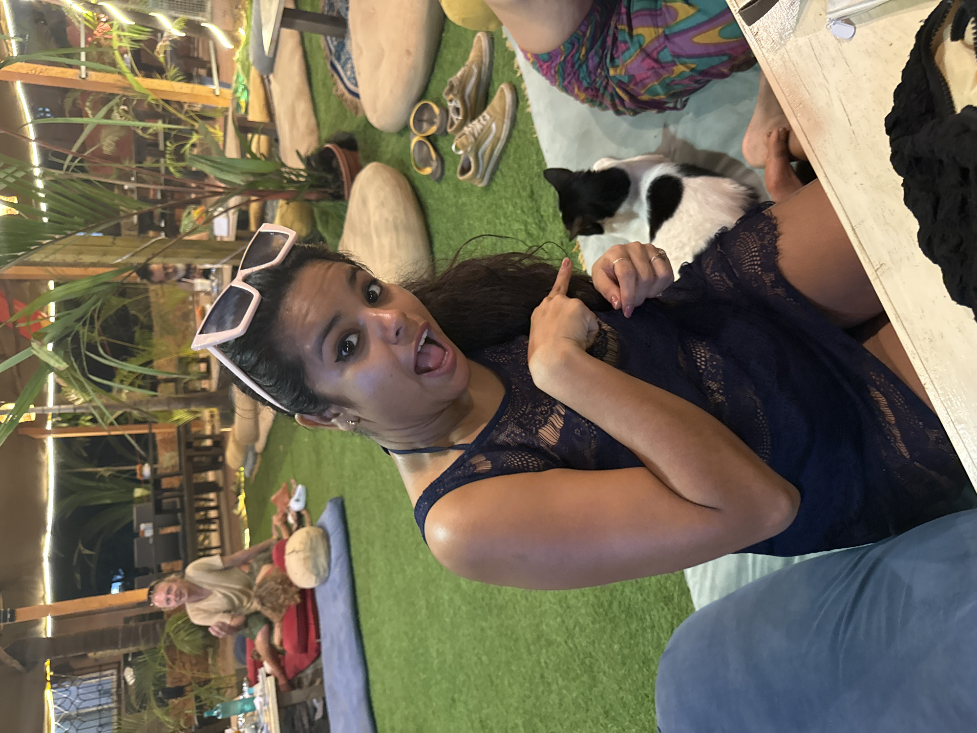 The image depicts a woman with dark hair and sunglasses wearing a navy blue lace top, pointing upwards with her right index finger, seemingly indoors or in a covered outdoor area. She is seated at a white table. A black and white cat is visible to the left of the woman, near a pair of tan shoes and several rounded beige cushions. Behind the cat, there is a person wearing colorful patterned clothing. A second person is situated in the background, near a row of tables and chairs under a thatched roof structure. The area appears to be decorated with potted plants and illuminated by string lights. The ground is covered with artificial green grass. Considering the location, the scene is most likely in Arambol, India.