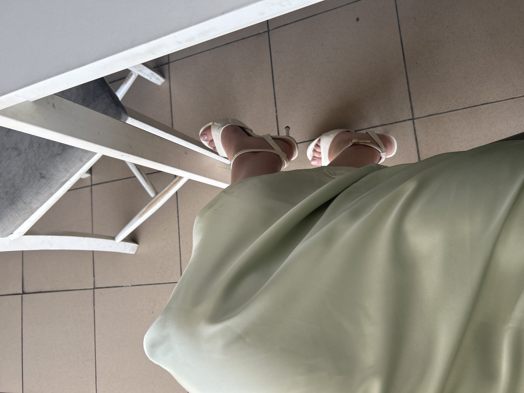 The image depicts a person's view from above, showing their feet in white heeled sandals, partly obscured by a light green fabric, likely a dress or skirt
