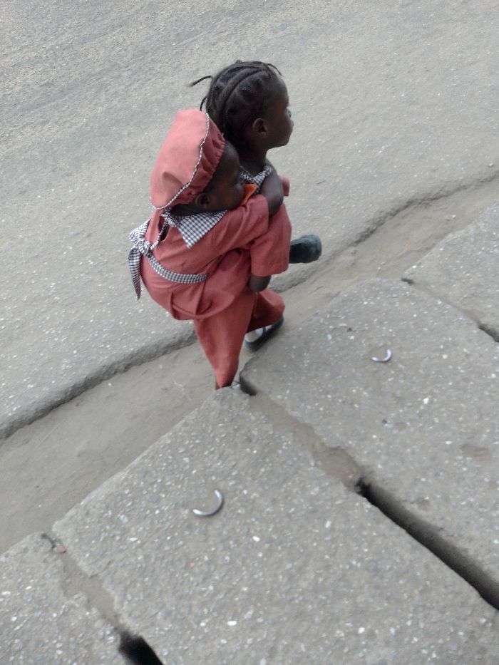 Two young African children dressed in matching salmon-colored outfits navigate concrete steps beside a paved road. The older child carries the younger one piggyback, their heads close together. The younger child wears a bonnet with a checkered trim and seems to be resting or sleeping. The worn concrete steps are cracked, and pieces of metal lie embedded in the surface, hinting at urban decay or a developing environment.