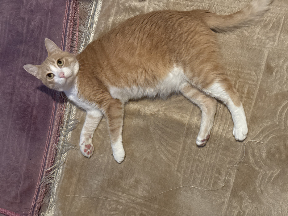 - "An orange and white domestic cat is observed lying on its back on a light brown, patterned carpet" by FM-xTDQG2, licensed under CC BY 4.0