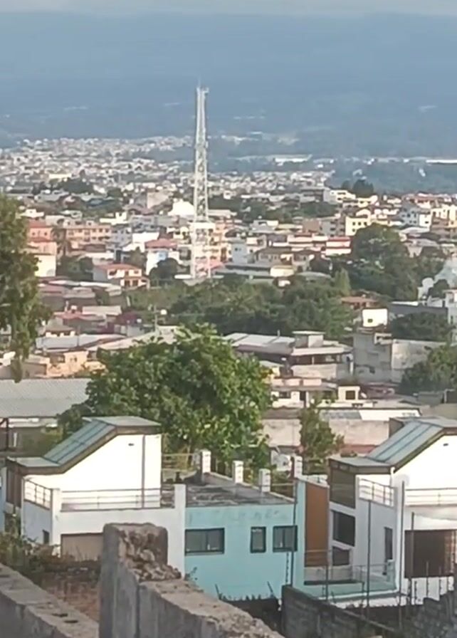 cityscape viewed from an elevated position, likely from a rooftop or hillside. The foreground features a rough, unfinished concrete block wall. Behind the wall are several houses with a variety of architectural styles and paint colors, some with flat roofs and others with sloped. Scattered trees punctuate the built environment. In the middle distance, the city extends, characterized by a dense network of buildings with a variety of roof colors. A tall white communication tower rises from the middle of the city, dominating the skyline. In the background, there are hazy mountains, providing a natural backdrop to the urban landscape. The sky is overcast.