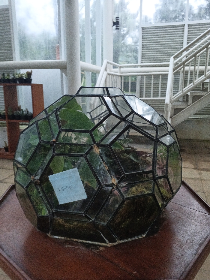 A dodecahedron terrarium sits on a wooden surface, filled with moss and leafy plants. A light blue note reading "RUSAK" is stuck to one of its panels. The background reveals an interior space with a metal staircase and windowed walls, suggesting a greenhouse or botanical garden. The overall scene is dimly lit.