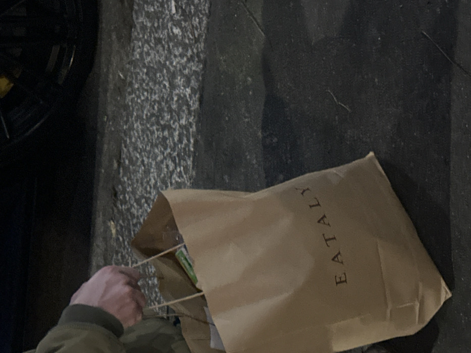 A partial view of a person's right hand and forearm, clad in a khaki-colored sleeve, is visible holding a light brown paper shopping bag by its white string handles. The bag, centrally positioned, prominently displays the word "EATALY" in dark capital letters. Inside the bag, a green-labeled package and other indistinct items are partially visible. The bag rests on a dark, granular ground surface, possibly asphalt or concrete. In the upper right background, the lower portion of a dark vehicle is present, revealing a black wheel rim, a tire, and a yellow brake caliper. The ground beyond the bag and beneath the vehicle is a lighter, textured pavement. The overall lighting conditions are dim. The image depicts an urban setting in Milan, Italy. The presence of an Eataly branded shopping bag indicates the scene is in proximity to an Eataly retail location, such as Eataly Smeraldo on Piazza XXV Aprile.