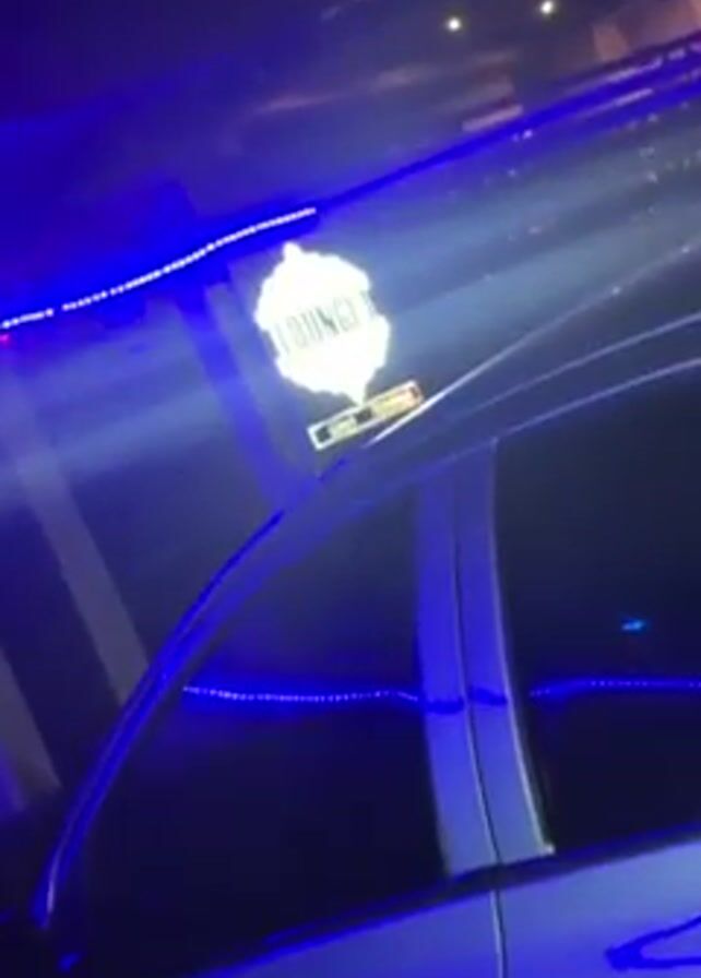 silver car parked outside of a building marked with blue neon lights and a sign that says "Lounge 11." The camera is pointed upwards toward the sign. The audio contains loud music.