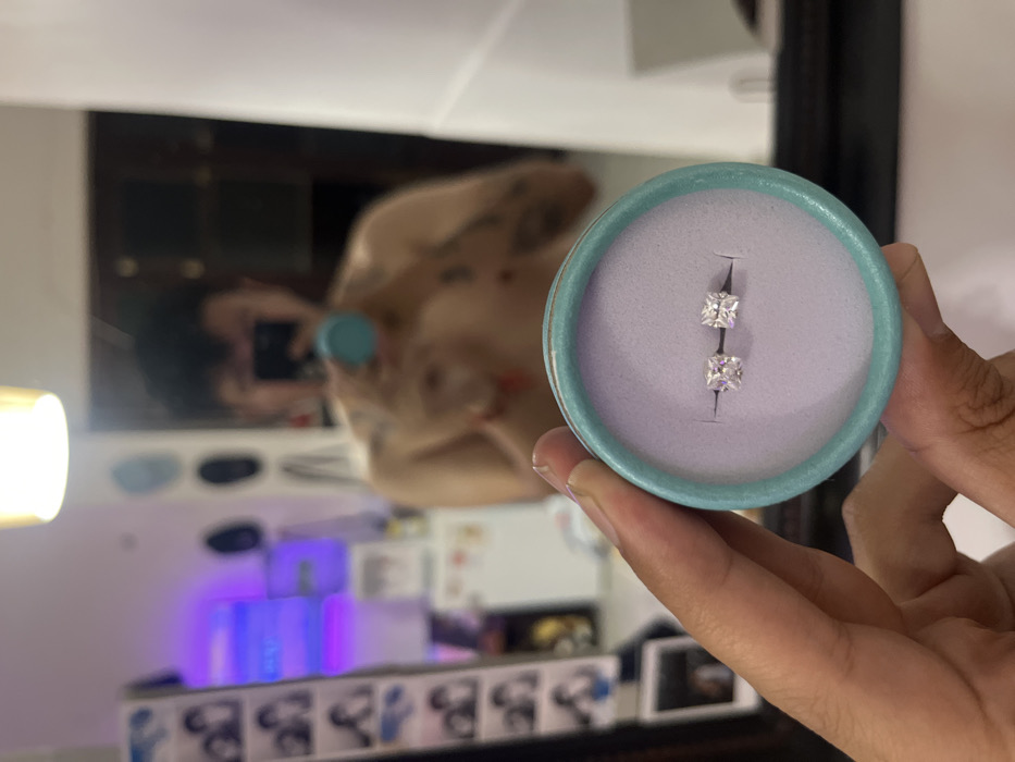 - "A close-up photograph displays a human hand holding an open, circular, teal-colored jewelry box containing two square-cut, clear stud earrings set against a light purple foam insert" by FM-Z0s923, licensed under CC BY 4.0