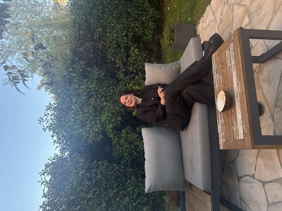 A single adult female is seated outdoors on a grey cushioned sofa with a dark metal frame and integrated wooden side table, situated on a flagstone patio in a garden in Rueil-Malmaison, France
