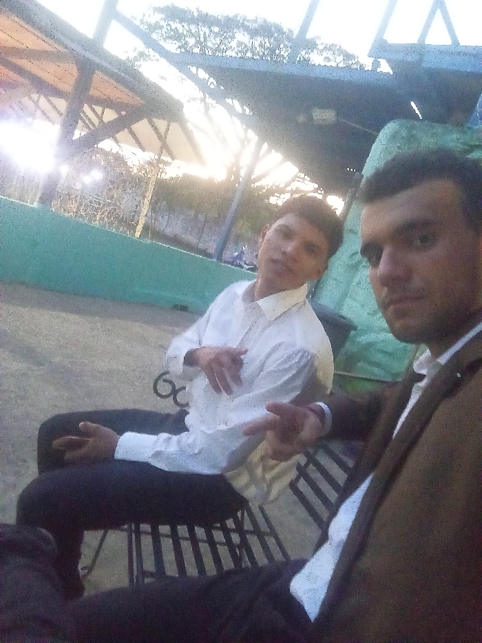 Two young men are seated on a metal bench outdoors. The man on the left wears a white dress shirt and black pants. The man on the right is dressed in a white shirt and a brown suit jacket. The sun is shining in the background. There's some sort of structure with metal beams around them. They are looking toward the camera.