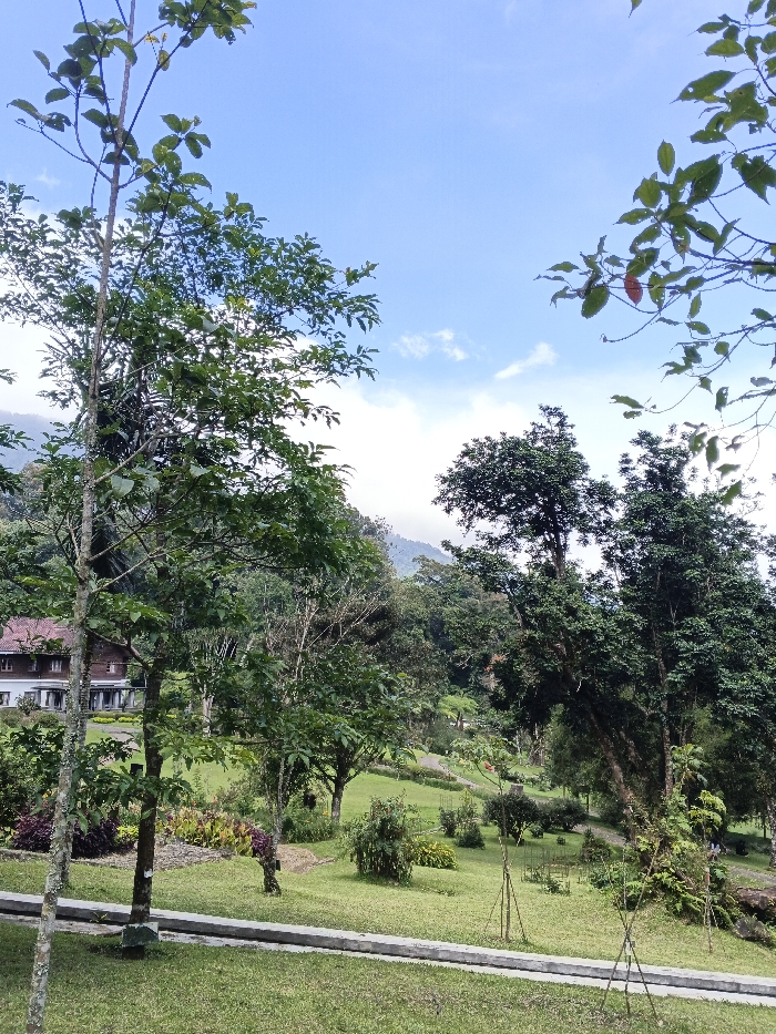 A daytime photograph captures a verdant landscape in La Castellana, Philippines. The upper portion of the frame features a clear blue sky with scattered white cumulus clouds. The scene is dominated by dense green foliage from numerous trees and shrubs, indicating a lush environment. A prominent tree with light-colored bark and green leaves stands in the left foreground, extending vertically. Branches with green leaves also frame the upper left and upper right edges of the image. In the mid-left background, a two-story building with a reddish-brown tiled roof and light-colored walls is partially visible, featuring a ground-level porch supported by columns. Manicured green lawns occupy the foreground and midground, separated by a horizontal concrete border or channel. Beyond this border, a garden area contains diverse plant life, including shrubs with reddish, yellowish, and green foliage, and visible dirt pathways winding through. Several young saplings are supported by wooden stakes in the grassy areas. Distant mountains, densely covered in trees, form the background. No individuals or animals are present within the frame.