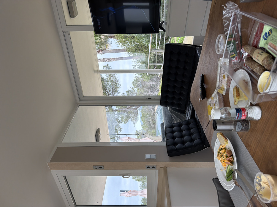 The image displays an indoor dining and living area within a residence in Santa Eulària des Riu, Spain. A wooden dining table occupies the foreground, set with an oval white plate containing a meal of what appears to be scrambled eggs or similar yellow and green ingredients, accompanied by a piece of bread and a slice of avocado. A fork and knife rest on a grey placemat next to the plate. Other items on the table include a salt shaker, a pepper grinder, empty plastic food packaging, a small white plate with a slice of cake, a clear plastic container holding various cured sausages/salamis and a yellow condiment tub, and a partially visible tub of light-colored spread. A black remote control lies on the table. Behind the table, two dark, tufted leather sofa sections are visible. The room features expansive windows and glass sliding doors, offering a panoramic view of the exterior. The outdoor scene includes a swimming pool, partially covered with a grey tarp, surrounded by lush green vegetation, including pine trees and several tall palm trees. A white railing is visible on a terrace overlooking a distant hilly landscape under a partly cloudy sky. Two light-colored patio umbrellas are visible further in the background. To the right, a flat-screen television displaying "V-XHD" is positioned on a white chest of drawers. The television screen exhibits a distinct crack. White walls, window frames, and ceiling are visible throughout the interior. A light-colored structural pillar on the left features two sets of electrical outlets or switches. No individuals are present in the scene.
