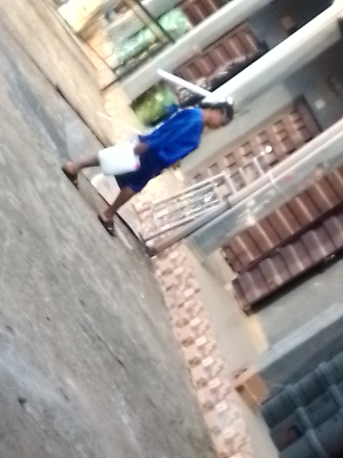 A person in a blue shirt and dark shorts walks on a tiled path. They carry a white container. To their right, a building features multiple shelves and rows of what appear to be items stored in boxes. The building's design includes a metal railing. The overall scene is somewhat blurry and shot from a low angle. The perspective is skewed, and the picture is not level.
