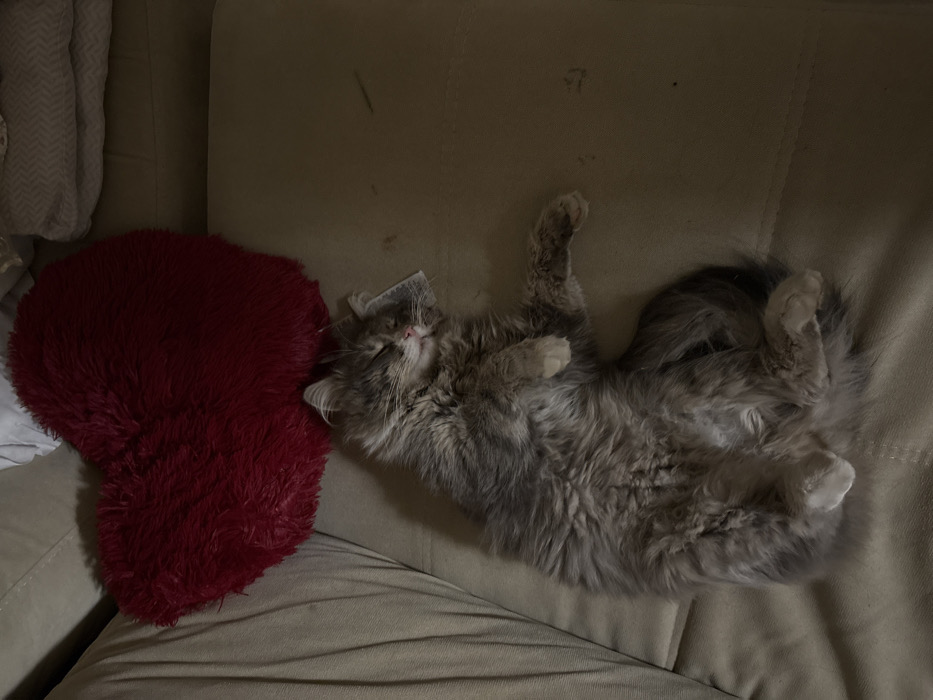 A domestic long-haired cat, exhibiting a gray and silver tabby pattern with white paws, is observed sleeping on its back on a light beige sofa in Mikrevo, Bulgaria. A fluffy red heart-shaped pillow is positioned behind the cat's head. A small, rectangular white object rests partially on the cat's head near its left ear. The cat's eyes are closed, and its limbs are slightly curled. The ambient lighting is dim.