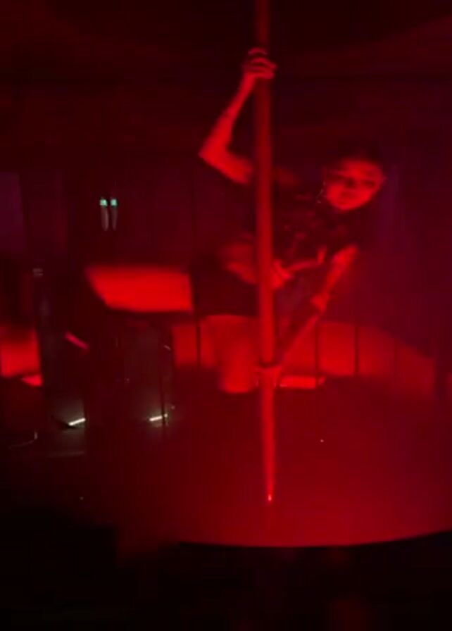 A woman with long dark hair performs a pole dance in a cage, illuminated by red light