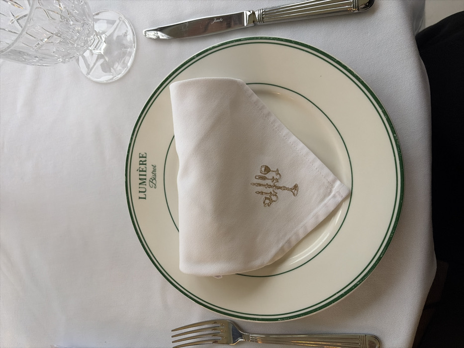 A single place setting at Lumière Bistro in Tivat, Montenegro, is depicted from an overhead perspective. A cream-colored plate, inscribed with "LUMIÈRE Bistro" in green and featuring a double green border, centers the composition. Upon the plate rests a triangularly folded white fabric napkin, embroidered with a gold-toned motif of a candelabra, two wine glasses, and cutlery. A silver-colored dinner fork with a ribbed handle is positioned to the left of the plate. To the right, a matching silver-colored dinner knife, bearing a faint "Jumbo" inscription on its blade, is present. A clear, cut-crystal stemmed glass occupies the upper right. The entire arrangement is situated on a white tablecloth. No individuals or dynamic actions are observed; the scene presents a prepared, unoccupied dining setup.