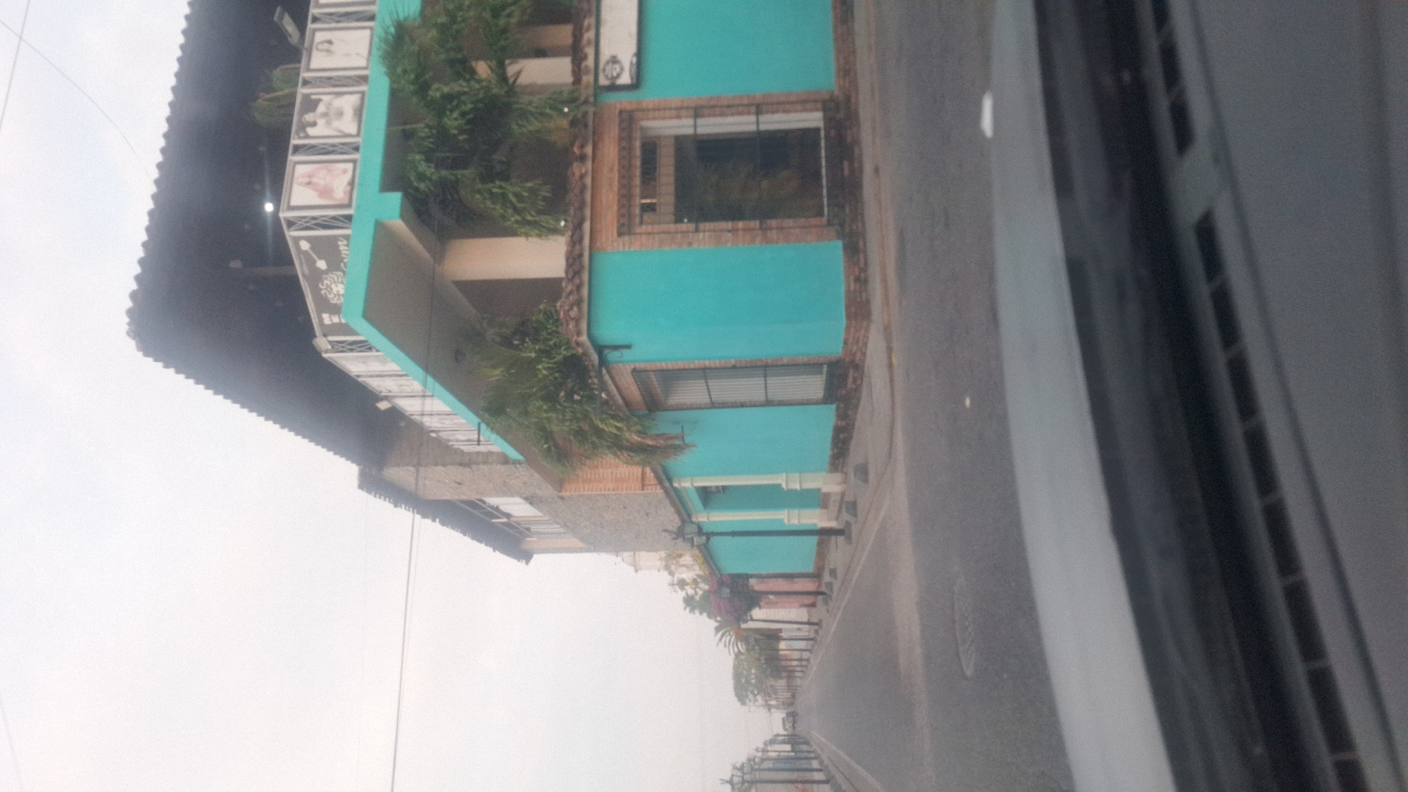 street view in San Carlos, Venezuela. A bright turquoise building with brick accents is prominent on the left side of the street. It has windows and a balcony adorned with plants. Other buildings line the street, receding into the distance. The sky is overcast. A road runs along the right side of the image, and the scene is viewed from inside a vehicle, with part of the car's interior visible on the right edge.
