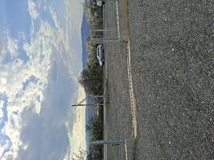 The scene depicts an outdoor gravel area opening onto a road, set against a mountainous background under a partly cloudy sky, identified as being in Barakovo, Bulgaria. The foreground consists of dark grey gravel. A concrete threshold defines an entrance, flanked by an open metal gate structure on the left and a simpler metal gate post on the right, both embedded in concrete. Beyond this, an asphalt road traverses the midground. A silver station wagon or SUV is visible on the road, moving towards the right. The road is bordered by trees and bushes, many displaying white blossoms. To the left of the road, a metal pole structure stands. In the background, distant hills or mountains are discernible beneath a sky featuring a mix of blue patches and substantial white and grey cumulus clouds. No people are present.