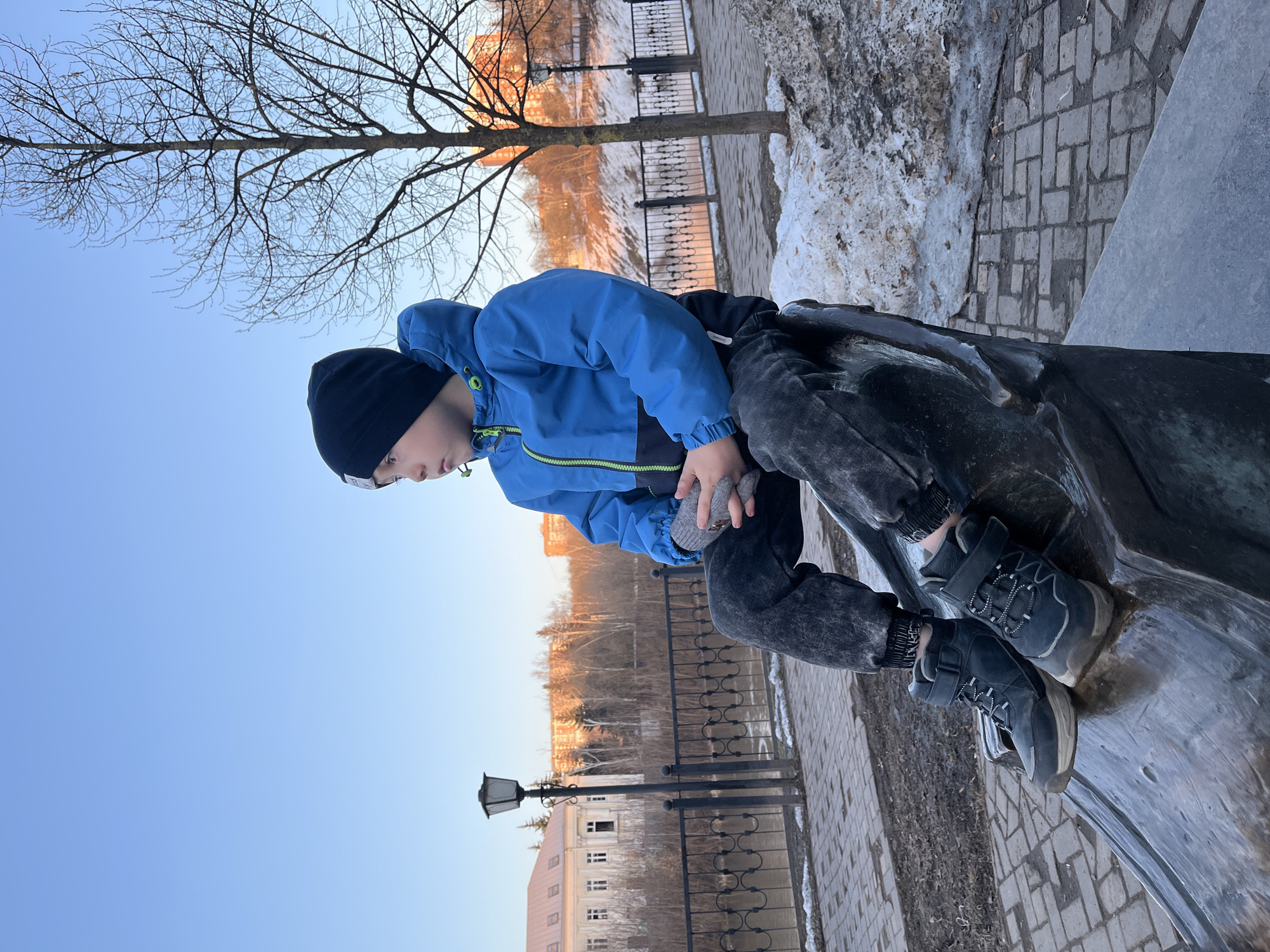 A young boy sits on a bronze sculpture in Podolsk, Russia. He is wearing a blue jacket, black jeans, black beanie, and dark-colored shoes. The sculpture is positioned on a paved area next to a snow-covered patch and a metal railing that borders a canal. In the background, there are buildings and trees without leaves. The sky is clear and blue. A lamppost can be seen near the canal.