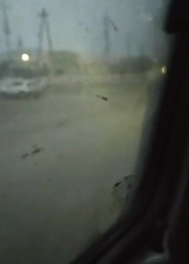 view from inside a vehicle, looking out a side window. The glass is somewhat fogged or wet. The outside scene is blurry but appears to be a gray, overcast day. There are utility poles with wires running along them. A couple of buildings are visible in the distance, along with a few lights. The road outside looks wet. The camera does not move much.