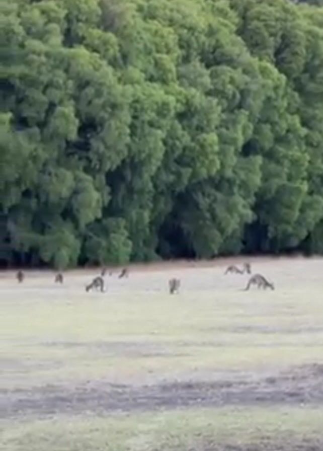 field with a lush, green forest in the background. Several kangaroos are scattered across the field, grazing on the grass. Some are standing while eating, while others are bending down to feed. One kangaroo leaps away from the group, moving rapidly across the field.