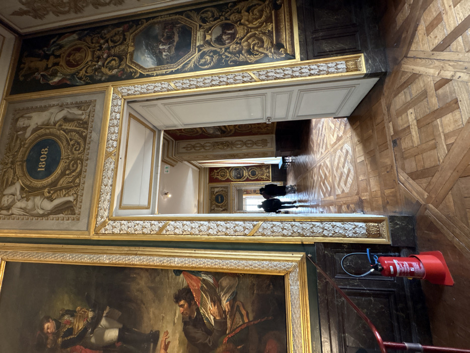 The image depicts an opulent interior hallway within the Palace of Versailles, France, likely one of the historical galleries such as the Salles de l'Empire or a related exhibition space. The perspective is looking forward through an open doorway into an adjoining room. On the left, a large, vertically oriented oil painting in an ornate gold frame occupies the wall from ceiling to near floor level. The painting depicts a standing figure in a military uniform (Napoleon Bonaparte) observing a wounded soldier lying on the ground, holding a flag. Below the painting is dark wooden paneling. A red fire extinguisher in a red floor stand is positioned to the left of the doorway, partially obscured by a red barrier rope extending out of frame. The central feature is an open doorway with a white, paneled door swung inwards to the right. The doorway frame is richly decorated with gold leaf and white foliate motifs. Above the doorway, an ornate golden panel features a central blue circle with the inscription "1808," flanked by two classical figures. The wall to the right of the doorway is dark with intricate golden vertical decorative elements and integrated paintings. One prominent painting depicts a historical battle scene with mounted figures in a mountainous landscape. Another smaller, ornate painting is visible below it, featuring classical figures. The floor throughout the visible space is covered with an elaborate parquet wood pattern. Through the open doorway, an elongated gallery or room is visible, illuminated by ceiling lights. This room features red walls adorned with further gold decorative elements and framed artworks. Two indistinct figures are seen walking away from the viewer in the distant section of this room. A light-colored bench or seat is positioned against the wall on the right side of the distant room. Another blue circular motif with "1808" is visible on the far wall of this adjoining room.
