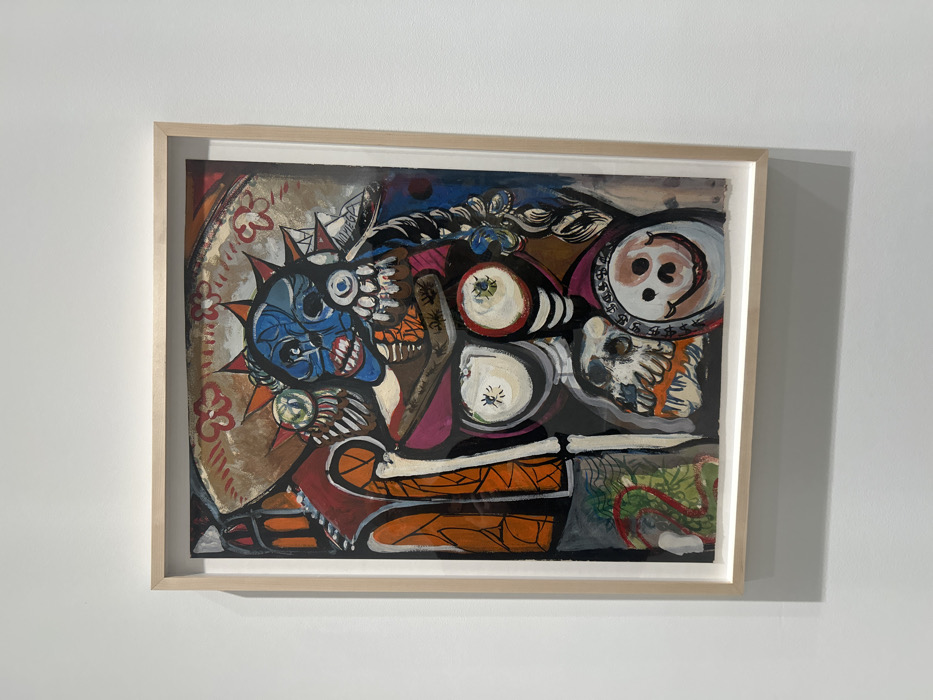 A framed painting with a light wood frame is on a white wall. The painting depicts an abstract arrangement of skulls and other grotesque figures in a cubist style. A blue skull with spiked protrusions dominates the left side. Several other skulls are scattered throughout the composition, along with abstract shapes and colors including brown, orange, and green. The overall aesthetic evokes death and decay in a disjointed, unsettling manner.