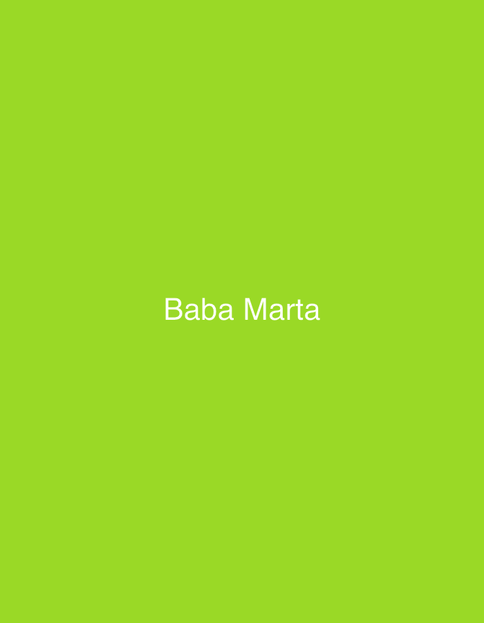 The image displays a solid lime green background. Centrally positioned, the white text "Baba Marta" is presented in a sans-serif font. This image is presented in the context of the city of Septemvri, Bulgaria. No individuals, specific objects beyond the text, actions, interactions, or environmental details are depicted.
