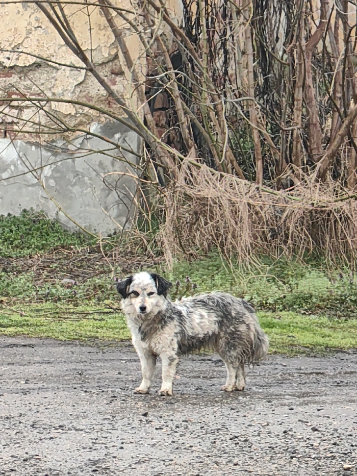 The image captures an outdoor scene in Dralfa, Bulgaria, under an overcast sky. In the foreground, a medium-sized dog with shaggy, mottled white, grey, and black fur stands on a wet, dark gravel or dirt path. Its fur appears damp, and its face is predominantly white with dark patches around its eyes and ears. The dog is oriented with its body facing right, but its head is turned left, looking directly at the viewer. Behind the dog, a strip of green grass and sparse dry vegetation extends. The background on the left features a section of a dilapidated building wall with peeling yellowish-orange paint revealing grey concrete and red brick. A lower portion of this wall is covered in grey plaster. To the right in the background, a dense cluster of leafless shrubs or small trees with thin, dark branches and dried, straw-like vegetation is visible. No other individuals or prominent objects are present.