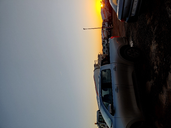 A silver pickup truck is parked on a dark, rough surface. Behind the truck, multiple cement mixer trucks stand in a line, fading into the sunset on the horizon. A car is parked beside the truck. The sky transitions from a pale orange near the horizon to a muted grey above.