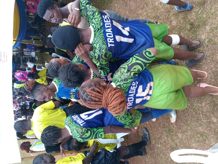 The image depicts an outdoor gathering on a brown and green grassy field in Meru, Kenya, under natural daylight. A central group of approximately ten individuals is observed, primarily young women. In the foreground, two individuals are positioned with their backs to the viewer; both wear blue athletic jerseys with patterned green sleeves and green shorts. The jersey on the left displays "TROADES 15" on the back, and the wearer has reddish-brown braided hair styled in a bun. The jersey on the right displays "TROADES 14," and the wearer's right knee is wrapped with a white bandage. To the right of these two, a woman in a light-colored polka-dotted top has her hands near the head of the individual wearing jersey number 14. To the left of this central cluster, a young woman with braided hair styled in a high bun is visible, smiling, and wearing a blue jersey with a "Betik" logo. A man in a yellow short-sleeved shirt is partially visible in the left midground, facing away. The background contains additional individuals, some wearing pink and black jerseys, seated on white chairs under a yellow and blue striped canopy. A white tent canopy is visible overhead.