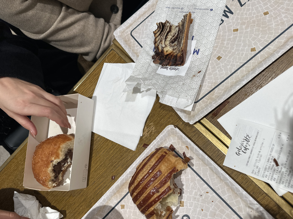 An overhead view captures a casual dining scene on a light brown wooden table with a gold-colored metal trim. The setting is Galeries Lafayette Gourmet in Paris, France, as indicated by a visible receipt and branded paper. A partially consumed, sugar-coated fried pastry with a dark chocolate filling is presented in a white cardboard box. A person's hands, with manicured fingernails, are positioned above the box, suggesting interaction with the pastry. To the left, a partially eaten chocolate-striped croissant-like pastry rests on a white patterned serving tray. To the right, a slice of chocolate babka, also partially eaten and displaying a distinct swirl of dark and light dough layers, lies on a "Lafayette Gourmet" branded paper lining on another white patterned tray. A crumpled white paper napkin and a crumpled receipt from "GALERIES LAFAYETTE," dated 07/11/2023, listing items like "BABA (AU POIDS) SP" and "CHOCG BICOLORE AE," are also on the table. Scattered crumbs are visible across the table surface and trays. In the upper right background, a person wearing a beige coat is partially visible.
