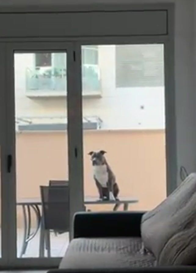 A dog is sitting on an outdoor table outside a glass door. The dog is grey and white and is facing the camera. The camera is inside the room and a couch is partially visible. Outside, there is a small table and chairs and a fence and building in the background. There is music playing in the background.