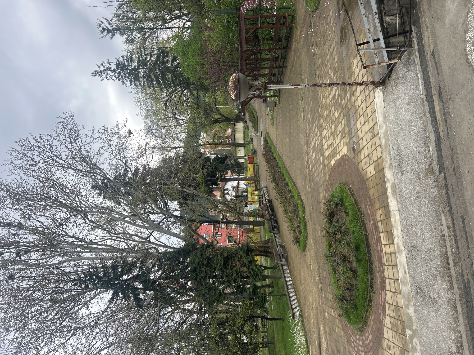 park scene in Kyustendil, Bulgaria. A tiled walkway curves through the park, bordered by flowerbeds and benches. Trees with bare branches are visible on the left, and evergreens are interspersed among them. A street lamp stands along the walkway. In the background, a red building and playground are visible. The sky is overcast. A building edge is seen from a high point of view.
