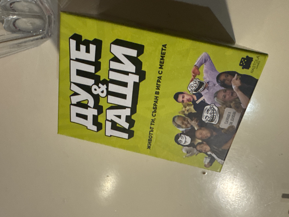 - "A lime green board game box titled "ДУПЕ & ГАЩИ" (Ass & Pants) with the subtitle "ЖИВОТЪТ ТИ, СЪБРАН В ИГРА С МЕМЕТА" (Your life, gathered in a game with memes) is depicted resting on a light-colored, reflective surface" by FM-JAIiX2, licensed under CC BY 4.0