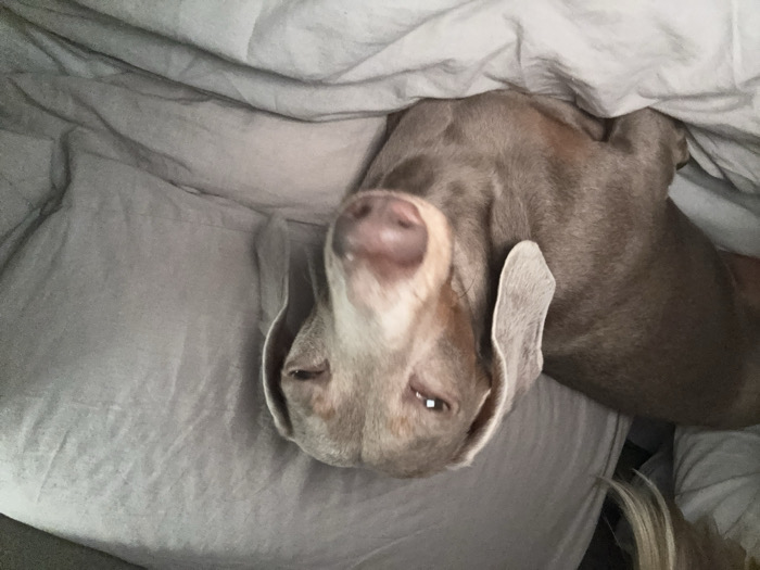 An indoor scene features a light grey-brown Dachshund-type dog resting on light grey bed linens