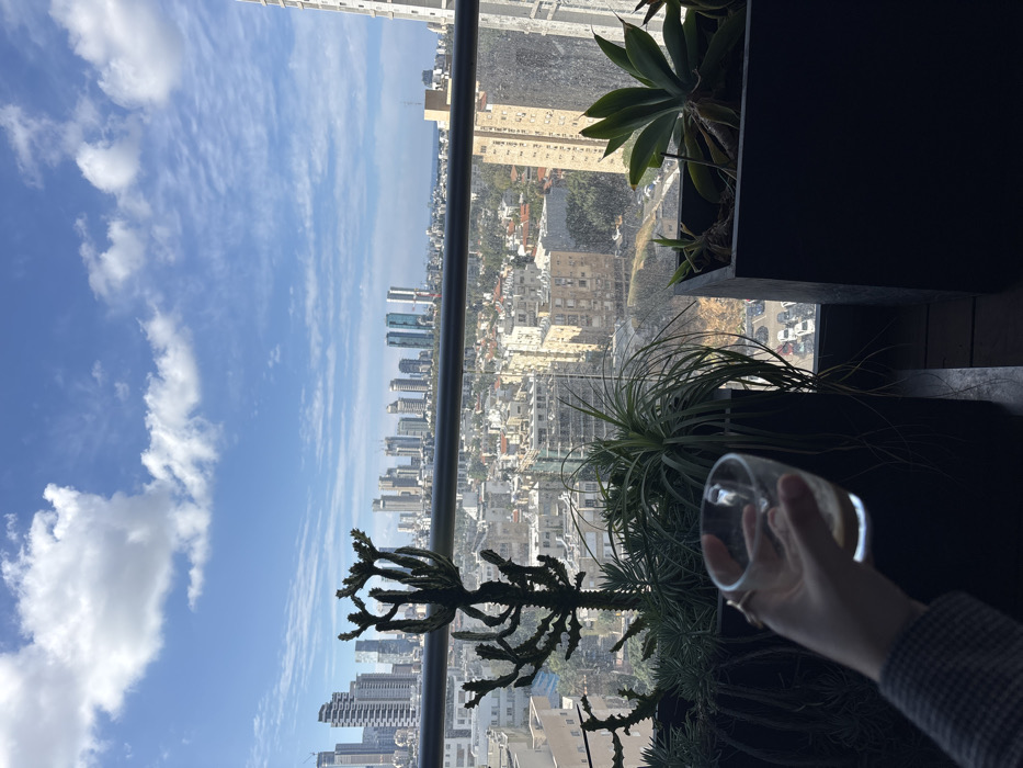 The image depicts an elevated view of a city, presumably from a balcony or high-rise window in Bnei Brak, Israel, looking west towards Tel Aviv and the Mediterranean Sea. In the immediate foreground, a person's right hand is visible, holding a clear glass cup containing a small amount of light brown liquid residue. The person wears a gray and white checkered long-sleeved garment. A dark, possibly metal, balcony railing extends horizontally across the lower-mid portion of the frame. Beyond the railing, several plants are contained in dark, rectangular planters. These include a tall, multi-branched cactus-like succulent on the left, other smaller succulents, and a spiky, long-leafed plant on the right. The midground reveals a dense urban landscape consisting of numerous multi-story residential and commercial buildings, varying in architectural style and height, extending to the horizon. Streets, vehicles, and green spaces are interspersed within the urban fabric. In the distant background, the distinctive skyline of Tel Aviv is prominent, featuring multiple modern high-rise buildings and skyscrapers, including several twin tower structures. Beyond the city, a strip of the Mediterranean Sea is discernible on the far horizon. The sky is bright blue with scattered white cumulus clouds, indicating clear daytime conditions. Sunlight illuminates the scene, casting subtle shadows.