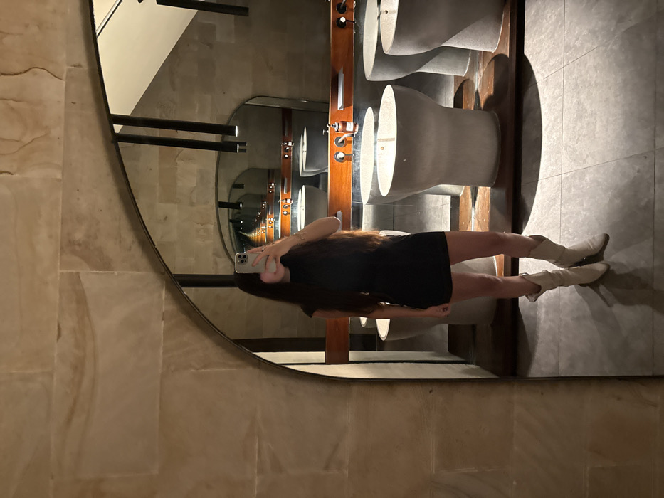 An individual is depicted taking a mirror selfie within a modern restroom facility in Tibubeneng, Indonesia. The subject, a female with long, dark hair, is positioned centrally, holding a light-colored smartphone with a visible camera module to obscure her face. She is wearing a black, sleeveless, high-neck mini-dress and light-colored, possibly off-white or beige, cowboy boots. The restroom features a large, arched mirror reflecting a repeating pattern of architectural elements and fixtures, creating an illusion of depth. Visible in the reflection are multiple free-standing, gray, concrete-like pedestal sinks, each fitted with dark, wall-mounted faucets and positioned along a dark wooden shelf or counter. Above the sinks, dark cylindrical pendant lights are suspended. The walls surrounding the mirror are constructed from light-toned, rectangular stone or tile blocks, exhibiting natural variations. The floor is tiled with large, light gray square tiles. The overall environment suggests an upscale, minimalist design.