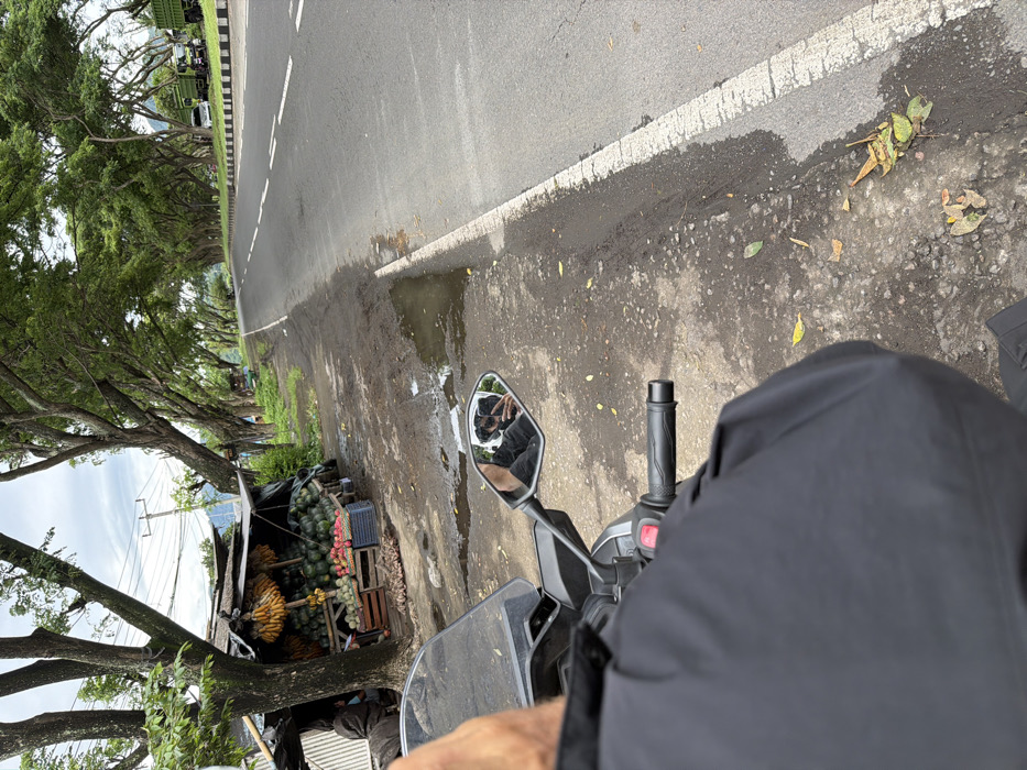 From a motorcycle rider's perspective, a roadside fruit stand displays watermelons, bananas, and other fruits along the side of an asphalt road lined with trees. The road has a white line marking its edge. The rider's black-clad legs are visible in the foreground, obscuring part of the motorcycle's controls. The motorcycle's mirror reflects the rider.