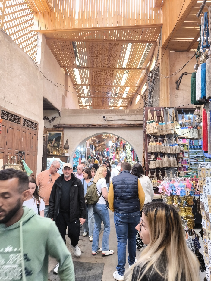 This image captures a bustling indoor market, likely a souk, within the Medina of Marrakesh, Morocco. The scene is illuminated by natural light filtering through an overhead wooden slatted canopy, which includes sections with intricate carved geometric patterns. The narrow passageway is flanked by market stalls and light-colored plaster walls. On the right, merchandise hangs vertically, including colorful tassels in blue, green, white, and red, alongside rows of small decorative brooms with varied handles. Below these, shelves display numerous small bottles and containers, possibly containing spices or perfumes, and a golden bowl holds fluffy, multi-colored decorative items. On the left, beyond visible wooden double doors, an arched opening reveals further stalls, including a framed painting and metal lanterns. Exposed electrical wiring runs along the walls and overhead. A small security camera is mounted on a wall above an archway. Approximately 15-20 individuals, appearing predominantly Caucasian, populate the scene. In the immediate foreground on the left, a man with short dark hair and a beard, wearing a light green hooded sweatshirt, is partially visible. In the mid-ground, a man wearing a beige baseball cap, a black jacket with a white logo, and dark pants walks towards the viewer. To his left, an older man in an orange t-shirt and glasses walks in the same direction. Further into the mid-ground, a woman with blonde hair, a white t-shirt, blue jeans, and a green backpack, walks away from the viewer, alongside a man in a dark blue padded vest over a yellow long-sleeved shirt and blue jeans. In the immediate foreground on the right, a woman with long blonde and brown hair and glasses is partially visible from the side, looking towards the market stalls. The background shows a crowded continuation of the market through several arched passageways.