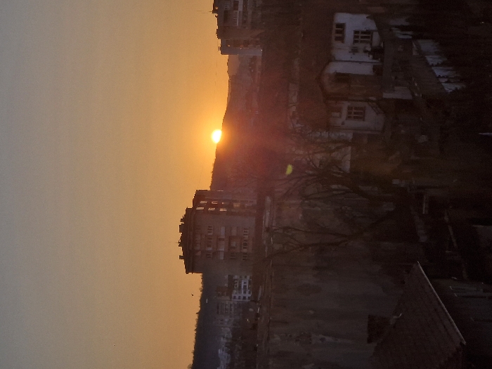 The image depicts an urban landscape in Lovech, Bulgaria, at sunset. The sky displays a gradient of orange-yellow near the horizon, transitioning to a pale blue-grey overhead. The sun is visible as a bright, partially obscured disc resting on the distant horizon, which is defined by a low, undulating line of hills. A subtle lens flare is present near the sun. In the mid-ground, a prominent, dark-colored, multi-story apartment building with numerous windows is situated slightly left of center. Another similar, less distinct multi-story building is visible towards the far right. The foreground features several older, smaller residential structures, predominantly obscured by deep shadows. One distinct two-story house, painted white with brown window frames and a dark, sloped roof, is visible on the right. A partial view of a dark tiled roof is in the bottom-left corner. Bare, deciduous trees with visible branches are scattered throughout the mid-ground and foreground, suggesting a cooler season. No individuals or discernible actions are visible. Small, dark specks, possibly birds, are present in the upper sky.
