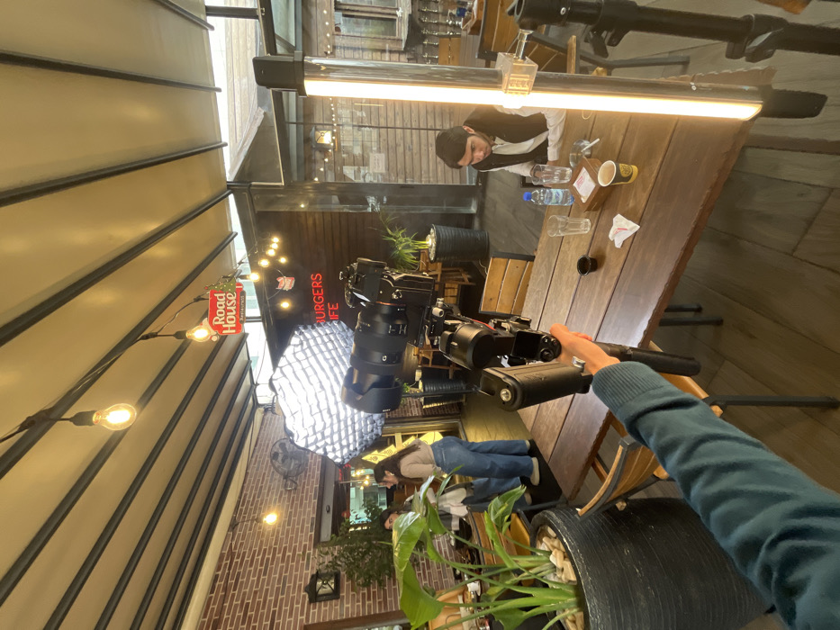 The image depicts a film or photoshoot setup inside the "Road House Restaurant" in Kafr Sousa Municipality, Syria