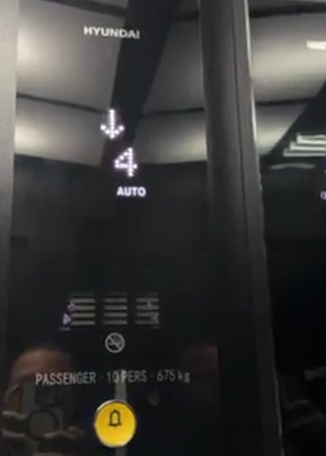n interior elevator display panel moving from the fourth floor downward through the third and second floors. The display indicates the brand of the elevator as Hyundai. The display also shows the direction of travel with a down arrow and the designation of "AUTO". Additional details include the passenger capacity (10 people) and maximum weight (675 kg). A reflection of a person holding a phone is visible in the panel.