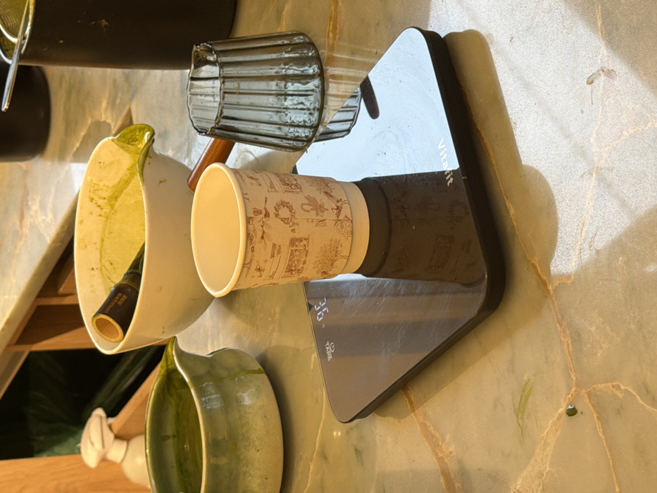 The image depicts an indoor scene on a light-colored, veined countertop, likely a beverage preparation area. In the foreground, a black digital scale, branded "Vitafit," displays a reading of "36." A disposable paper cup, light beige with dark brown illustrations of buildings and foliage, rests centrally on the scale. To the right of the scale, an empty fluted glass with a dark tint is positioned next to a brown wooden utensil. In the background, a white mixing bowl contains a vibrant green liquid, possibly a beverage concentrate, with a dark-colored bottle or utensil partially submerged. To the left of the bowl, a green ceramic pouring jug is visible. Further back, a white spray bottle and wooden shelving units are partially obscured. A tall, dark container with a spoon or whisk extending from it is partially visible on the far right. The countertop has visible splatters of green liquid and minor debris. No individuals are present. The precise location within the city of Unknown, Unknown, is indeterminate from the visual information provided.