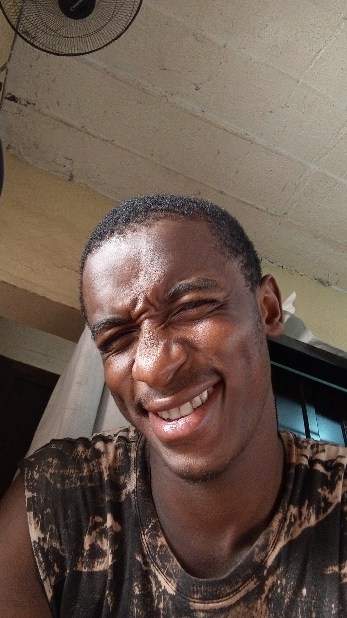 - "The image displays a close-up portrait of a dark-skinned male individual, approximately 20-30 years of age, exhibiting a strong facial expression characterized by tightly squinted eyes, a wrinkled nose, and a wide open-mouthed smile revealing his upper teeth" by FM-1O94j1, licensed under CC BY 4.0