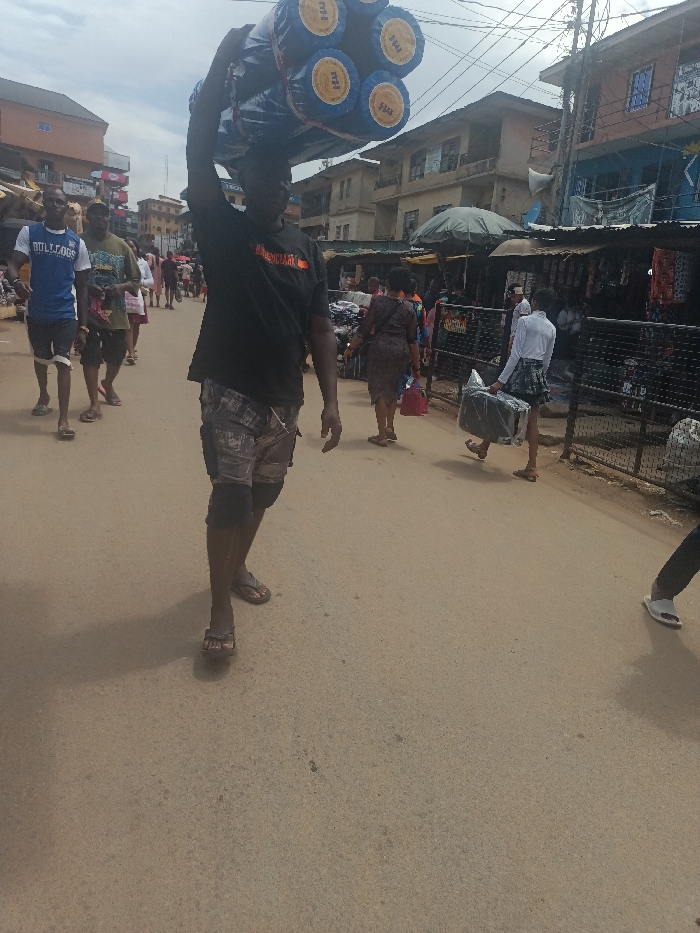 A daylight street scene in Unguwar Kaya, Nigeria, captures a bustling urban environment. A male individual dominates the foreground, walking towards the viewer, expertly balancing a large, strapped bundle of six blue, cylindrical objects with yellow circular labels on his head, while his left arm is raised for support. He wears a dark t-shirt, patterned shorts, and dark sandals. To his left, two additional males walk away from the viewer; one wears a blue "BULLDOGS" t-shirt, the other a green t-shirt. To the right, an adult female in a patterned dress carries a red bag, and another pedestrian in a white shirt and patterned skirt carries a clear-wrapped package, both moving away from the camera alongside market stalls. These stalls feature corrugated metal roofs and an olive-green umbrella, bordering a dark metal fence. Behind the commercial activity, multi-story buildings with balconies are visible. The paved street is light brown/grey, and overhead utility wires crisscross an overcast sky. Numerous indistinct pedestrians are present throughout the background, indicating high foot traffic.