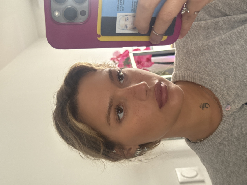 A young adult female is depicted in a close-up, self-portrait taken indoors in Nogent-sur-Marne, France