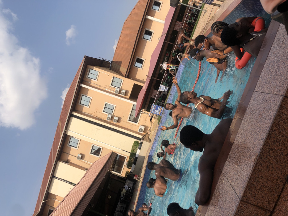 A group of young men are enjoying a swim in an outdoor pool next to a tall building under a bright sky with light clouds. Some are in the water, some are at the edge of the pool and some have floatation devices. The water is clear and blue. A bar and some tables are visible next to the pool.