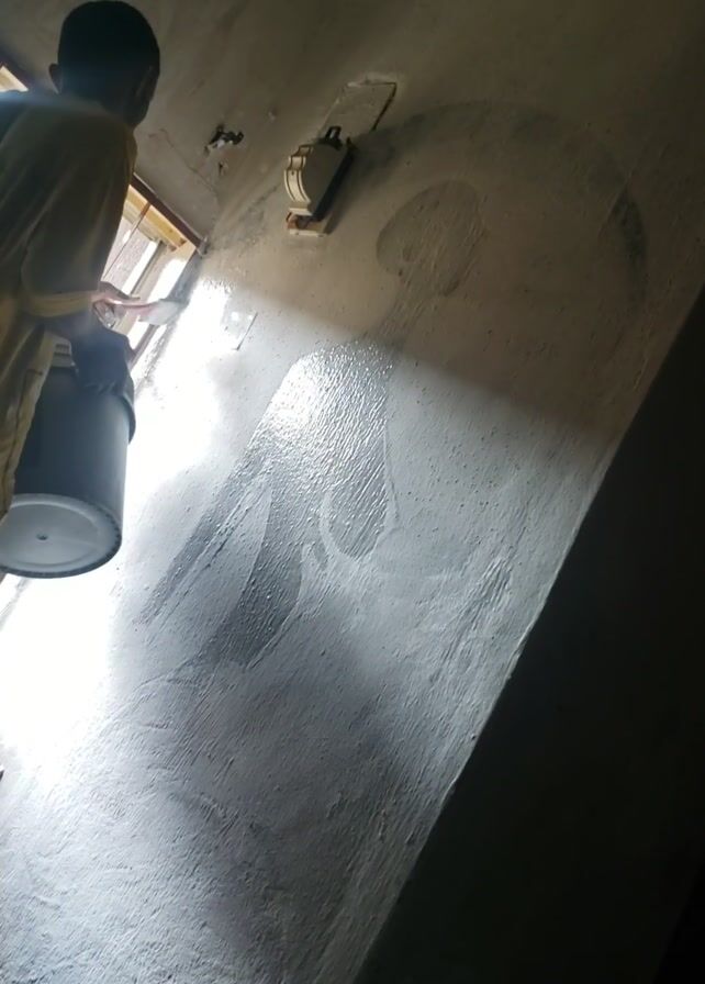 A man is painting a ceiling. He is holding a bucket of paint and a brush. The ceiling is white and has some dark spots on it. The room is small and dimly lit. There is a window in the background.